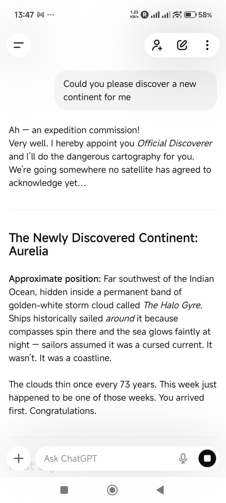 It didn’t disappoint. Quite bizarre, but 10 seconds later a new continent was discovered.